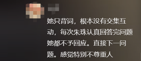 還有朱珠明明對她提問(wèn)的每個(gè)問(wèn)題都進(jìn)行了延伸回答,她卻只是按設定問(wèn)題走流程,完全沒(méi)有互動(dòng),就仿佛一個(gè)人形提詞器。