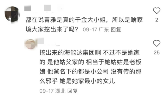 當時(shí)就有人挖出來(lái)了她的背景,雖然不是巨富,但也是有家底,相當于上市公司的表小姐吧: