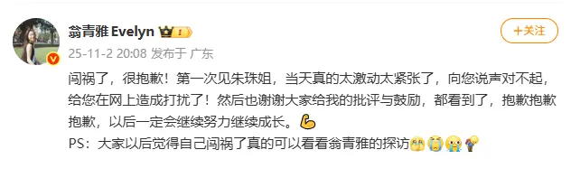 “大家以后覺(jué)得自己闖禍了真的可以看看翁青雅的探訪(fǎng)?!?/p>